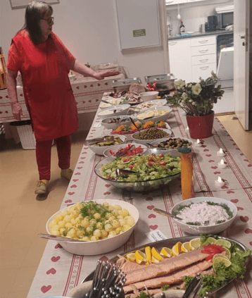 Esityksen jälkeen alkoikin vatsa jo kurnia ja pääsimme nauttimaan Hilkan valmistamasta maukkaasta ja monipuolisesta jouluateriasta. Tarjolla oli kaikki herkut kinkusta silleihin ja salaatteihin. Jälkiruokana oli ihanaa puolukkarahkaa.