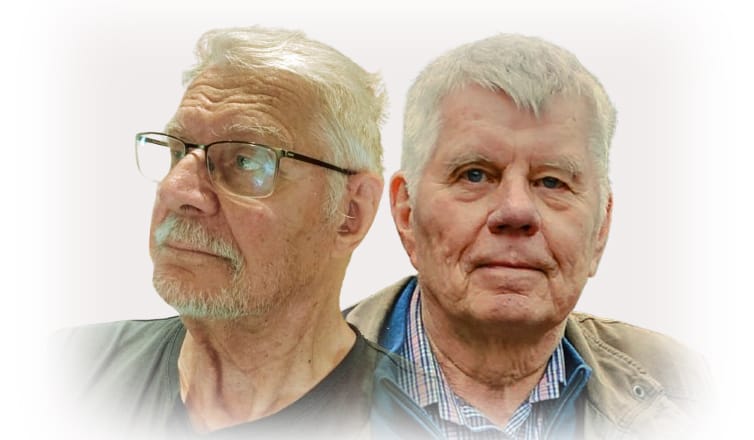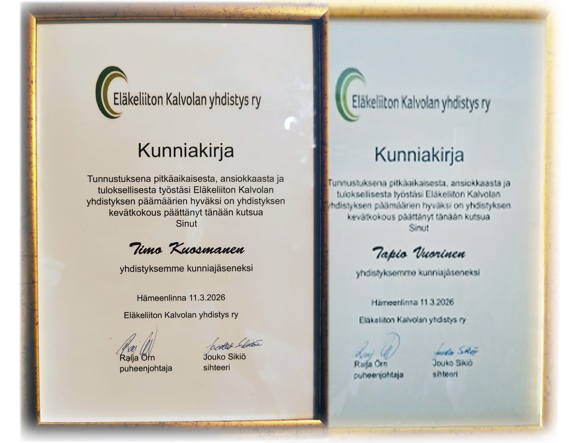 Kunniajäsenet Timo Kuosmanen ja Tapio Vuorinen. Kiitos Eläkeliiton Kalvolan yhdistyksen hallitukselle muistamisesta, kun jäimme pois yhdistyksen hallitustyöskentelystä.